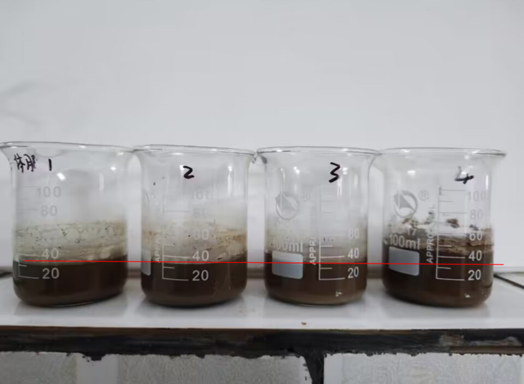 試驗(yàn)方法:取相同板結(jié)地塊過(guò)0.5mm篩40g土樣4份加入4個(gè)100ml燒杯中,加水20ml,充分?jǐn)嚢韬箪o置沉淀。